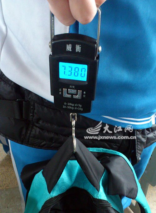 高中生书包重:(六名)6.295公斤、7.085公斤、7.380公斤、6.588公斤、6.730公斤、6.990公斤
