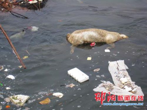2月11日,在无名小溪汇入唐家坊河的入口处,记者放眼望去,只见一条水泥大坝将唐家坊河一举拦为上下两截。整条河除了从大坝上倾泻而下的河水呈现白色外,用“不堪入目”四个字来形容它的全貌非常恰当。在大坝下,除了各色垃圾漂浮、旋转外,一头被河水泡得发胀的死猪正在与垃圾们一起沉浮;大坝之上,也有一头被水泡得更胀的死猪正横卧在大坝的溢水口处,仿佛在哀叹着自己,也哀叹着这条小河。