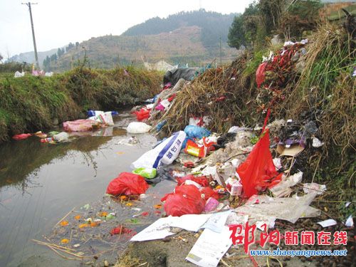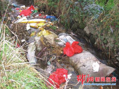 2013年2月11日,正月初二,唐家坊镇唐市村与全国各地所有的乡村一样,正沉浸新春佳节的喜庆气氛之中。然而紧邻该村八组和二组的无名小溪,却仿佛在默默地哭泣。记者在溪边看到,昔日人来人往、热闹非凡的八组和二组码头,如今空空荡荡不见一人;在二组码头边,一堆垃圾小山般地躺着;再往下游3米开外,一堆用纤维袋装着的垃圾已将小溪完全堵住。整条无名小溪中,塑料袋、女性用品、尿不湿、烂水果、碎砖破瓦等成了当之无愧的主人;在小溪一些河段,还可以清晰地看到粪便漂浮在溪水中。