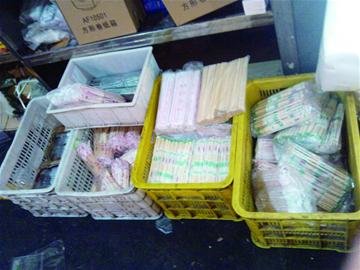 这些一次性木筷从哪儿进的货?根据几名小吃店店主提供的线索,记者来到抚顺路批发市场酒店用品区域。一番探访后记者发现这里销售的一次性筷子大部分都是“三无”产品。记者首先来到一家销售一次性餐具的摊铺前,看到地上的纸箱里盛满了各种各样的一次性筷子,既有常见的木质筷子,也有一些竹制筷子,这些筷子只是简单地盛放在透明塑料袋子里面。