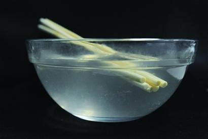 记者将带回的几种一次性筷子分别放入热水中,搅动3分钟发现热水颜色均发生些许改变,其中一只杯子在搅动之后水中出现了大量的白色絮状物,原本清澈的水也变得浑浊。