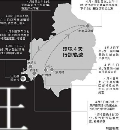 其实4月10日,华商报已率先报道了这一令人震惊的案件。当天,警方发布消息称,2013年4月5日12时53分,商南县警方接到报警:发现十里坪镇黑沟村石板沟组村民孙开成与妻子李哑巴死在自己家中。4月6日,又发现该村村民陈义学、党翠兰夫妇死于家中。警方经过对两起命案现场的勘验,发现两起案件的受害者均为偏远山区留守老人,且都是头部遭受钝器击打致死,现场有翻动过的侵财迹象等共同点后,专案组判定为同一人作案,遂决定并案侦查。