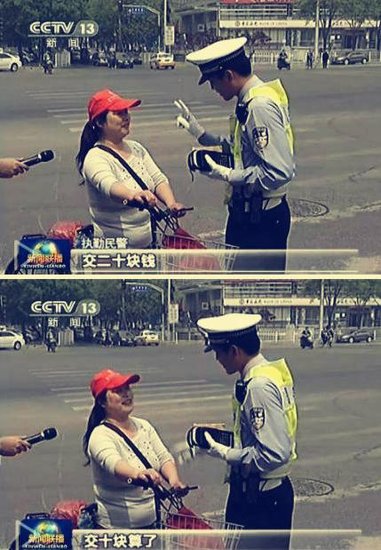 【大姐闯红灯被罚20元跟交警现场砍价】北京街头,一位骑车的大姐闯了红灯,交警要罚20块,大姐现场执着砍价,“罚20块”,“交10块吧”,“20块”,“10块吧”。。。大姐这真的不是菜市场。