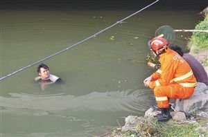 早上6点13分,北仑消防接警后赶到现场。参与救援的消防官兵说,小王所处的位置离岸边虽仅有2米远,但河水很深,已经将他除头部以下的位置全部淹没,小王脸色发青,紧咬着嘴唇,身体不住颤抖。他的母亲和弟弟正蹲在岸边,不停地劝他上岸,可小王仍无动于衷。