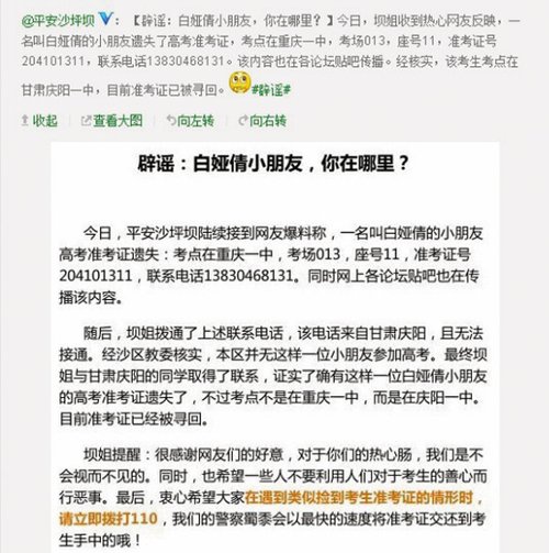 为了揭开真相,沙坪坝警方向庆阳一中进行了求证。老师称,该校确实有一位同学叫白娅倩,6月4日下午,因装考试物品的袋子破了,准考证不慎遗失,幸被好心网友捡到,已于5日上午领回了准考证,不会影响高考。