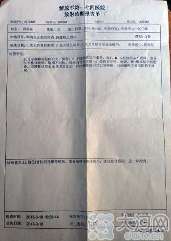 医生说,令人揪心的是她的脊柱问题,随着脊柱侧弯加重,她的肺功能将受影响,呼吸功能会变差。放射诊断报告显示,影花胸椎多个椎体发育畸形,导致重度脊柱侧弯,左下肢从髋关节到股骨、膝关节、足踝畸形。