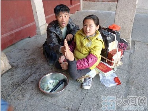 据影花说,七年前,有人到村子里来专门找残疾人,向附近邻居打听家住哪里,找到家长开个价钱,带他们出去演出。后来找到了影花的父亲,每个月给田振良几百元钱,影花便开始漫长的乞讨、卖唱生涯。“三个老板都不好,要不到钱就拿东西打我,最严重的不是拿东西打我,最严重的一次是被老板踹到地上,半天站不起来。有次天气特别冷,我说好冷好冷,他说不冷,回去就打我了。别说我是小孩了,就是大人也受不了。”因为怕再挨打,影花报了警。