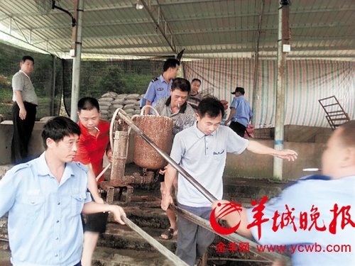 为了尽快捣毁叶华村这个灌猪场,记者立即致电梅县和兴宁市相关负责人。下午5时,梅县畲江镇政府组织执法人员来到这个灌猪场,查封了至少二三十吨的灌猪饲料,以及大量灌猪加压设备,镇派出所也对相关人员进行了传唤。