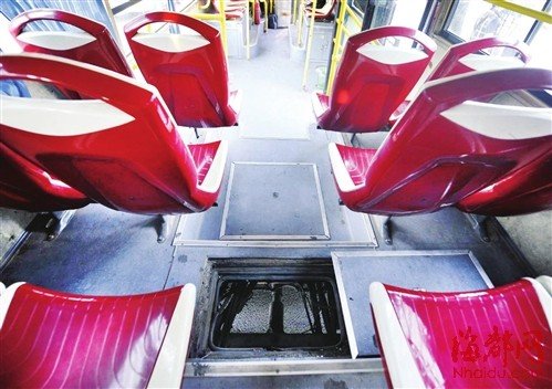 记者赶到于山站时,一辆97路公交车停在站点前方,受伤老人已被送往医院。记者走上公交车,在后侧第三排座位的走道上,一块长、宽各约四五十厘米的盖板放在右侧座位外,过道上出现一个大窟窿。