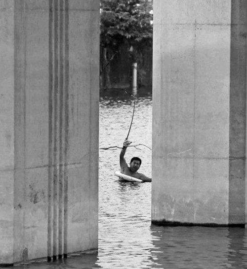 金山大桥距金山湖约15米高,该男子跳下后很快浮出水面。目击者称,在水面表演了一段花式游泳后,该男子距岸边已不到20米。来回游了约3分钟,该男子一个猛子扎进水底,再没上来。