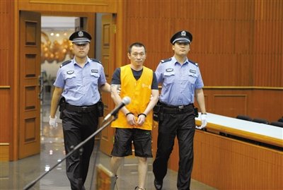 被告人走进法庭。昨日,仲鑫因运输289余克毒品,被北京一中院判处无期徒刑。通讯员 李佳 摄