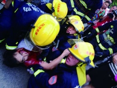 下午6点半,消防员将一名伤者抬离现场,此人浑身是血,人已近昏迷,120急救车先将他送往市第一医院救治。后来赶到的又一批消防员也参与了营救,6点50分左右,被埋在玻璃下的陈先生被救出,其头部、上身全是血迹,受伤严重,随后也被120急救车送往市第一医院救治。