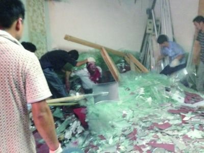 店老板被碎玻璃埋住了下半身,上身已经鲜血淋漓。