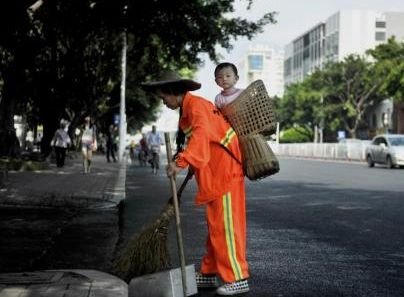 环卫工田文兰背着外孙女扫大街 图片来自微博