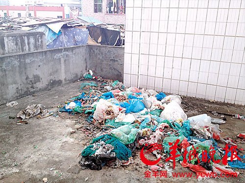 在黄先生家的墙壁上,仍残留着一些屎状物。从黄家的1楼走到4楼,原本透明的玻璃窗,现在都已经染成了灰黑色。走到天台,这里更像一个垃圾池,碎玻璃、饭盒、果屑等生活垃圾满地都是,里面甚至夹杂数只老鼠的尸体,大热天时,发出阵阵的恶臭。