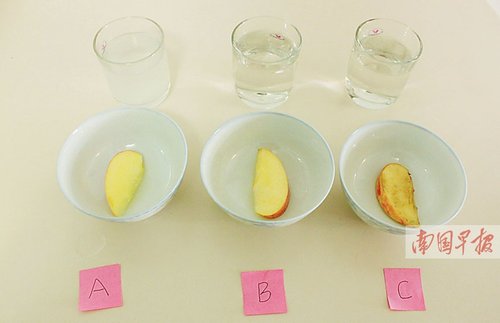 实验 图二:将现切苹果片分别投入维生素溶液(A)、盐水(B)、纯净水(C)中浸泡10分钟