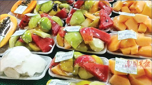 带着钟女士的疑问,19日上午,记者来到了这家位于南宁市星光大道的超市。在水果销售区,记者看到,多种切开的水果被保鲜膜装好一同销售,里面的各类水果看起来都是刚刚切的。随机选取几盒做下标记后,记者离开超市。