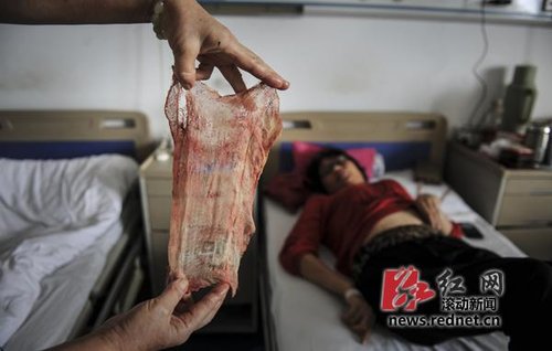 今天(9月2日)上午,湖南省胸科(结核病)医院一外科病房内,张美丽出示了那块纱布:长约25厘米,宽约20厘米,满是血渍,已经有些发臭。