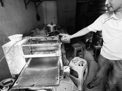 记者找到菜场旁馒头店与压断汪师傅夫妻手相似的电动擀面机。记者杨涛实习生张仰强摄