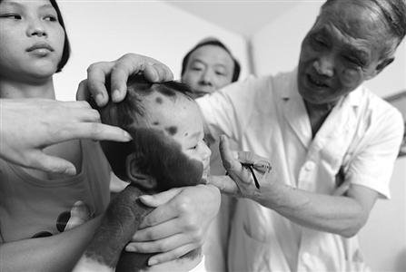 家住福建三明农村的王先生和“90后”妈妈郑女士第一次来上海,妈妈抱着6月大的女婴一脸愁容,此行是专门为女儿小欣言的病来沪求医。6月大的小欣言长着一张“熊猫脸”,因脸上尤其是双脸颊两侧都有黑色巨痣,且面积不小。除了脸上、耳部,小欣言的整个后背、手臂、双腿上都是相似的黑斑,黑斑面积超过全身一半皮肤。
