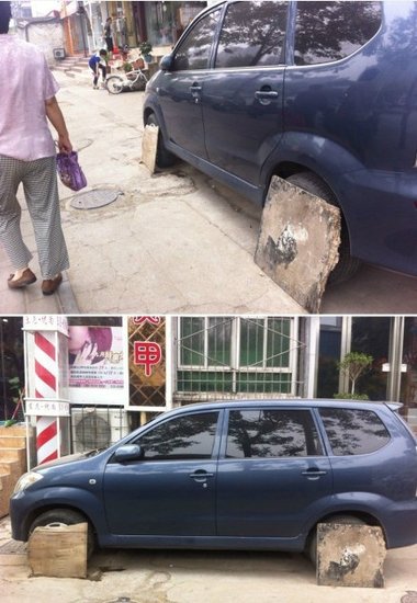 【防狗尿神器】市民蒋先生家住郑州市棉纺路桐柏路交叉口附近一老小区内,经常将爱车停在院内或路边。因附近养狗居民较多,每天早晨,爱车车轮上都会沾上不少狗尿,蒋先生想了个主意,找一个车轮大小的木板穿几个洞,用绳子绑在轮胎上,从而保护车轮。(河南商报 (微博) 记者 姬中贵 张郁)