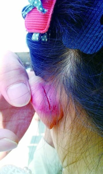 家长忙仔细检查,看完大家都吃了一惊:孩子的左耳根部,出现一道约3厘米的伤口,另外还有两道小伤口,伤口血迹未干。
