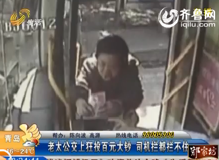 青岛老太公交车上狂投百元大钞 司机拦都拦不住(监控截图)