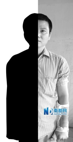 经过半个多月的治疗,黄广现的手臂上仍打着石膏,拇指仍不能动弹。