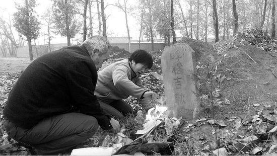 李三仁夫妇清早来到儿子坟前,为儿子烧寒衣
