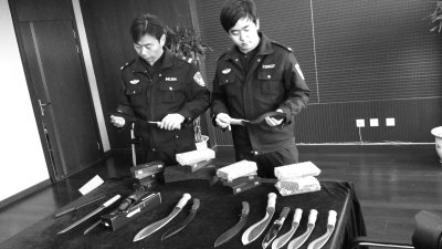 在锁定了吴某的犯罪证据后,警方于12月13日上午出动10余名警力来到吴某店中,将他控制后从其仓库内搜出一箱管制刀具。经警方清理,共有100余把,其中还有警用匕首。“这些砍刀和匕首是禁止携带的,如果贩卖需要相关部门审批,一旦流入社会将带来很大安全隐患。”承办此案的民警介绍道,记者从这些被查获的刀具中看到其中不乏一些仿制名牌刀具,而大部分刀具都已开锋。随后吴某被带回科技园派出所接受调查。