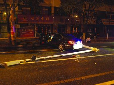 事发后,六合交巡警大队民警赶到现场,只见奔驰轿车冲向人行道上,车头严重受损,车身也有多处刮擦痕迹。旁边一根断裂的监控杆,开车的女青年因惊吓过度蹲在路边。经询问,她说凌晨两点从家里驾车出门买夜宵,买完夜宵后,从秦苑路转入白果路时,突然接到家人打来的电话。