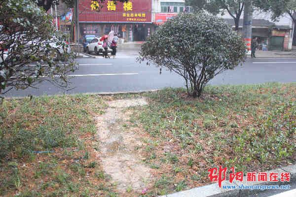 邵阳新闻在线讯(记者 伍洁)双坡南路高标准建设的绿化带于春节前竣工,虽然绿化带上专门修建了4个人行通道,但是不少市民为图方便,任意践踏绿地,如今建好不到一个月的绿化带上已出现10多条人为践踏的足迹,着实令人痛心。图为踩踏地之一。