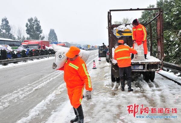 邵阳高速公路管理处的养护工们用人工撒融雪剂化雪