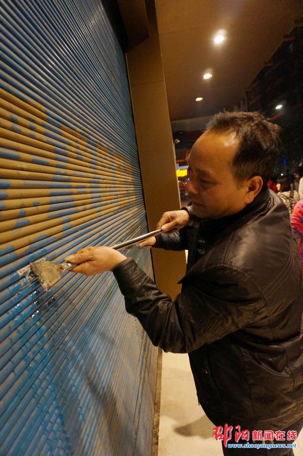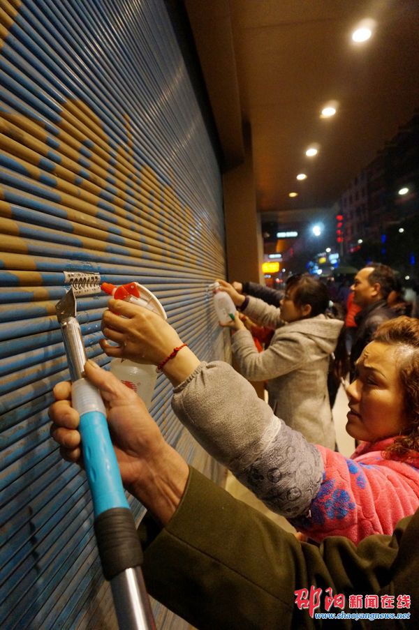 图为为防止伤到卷闸门,工作人员喷上水后,用小铲小心翼翼地剔除每块“牛皮癣”