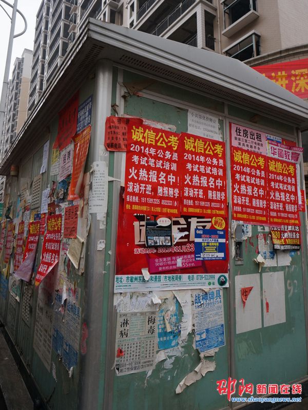 在位于敏州东路的桂苑小区里,一座挂彩的配电房成为路边一道醒目且尴尬的景观。公考、住房出租、招聘、治病……各种款式、各种花色的“牛皮癣”广告贴得里三层外三层,将配电房严严实实地包裹了起来。“我们以前也动手清理过,费了好大的劲清干净,但是没过好久广告又贴上去了,后来大家就干脆任其‘自生自灭’了。”居民李阿姨说,配电房被“牛皮癣”包围的事大家开始都觉得无奈又闹心,但似乎总找不到合理的根治办法,后来渐渐地就习以为常了,配电房现在俨然变成了广告发布栏。