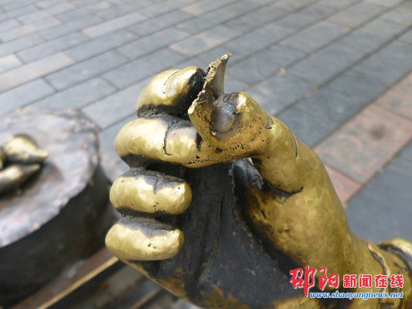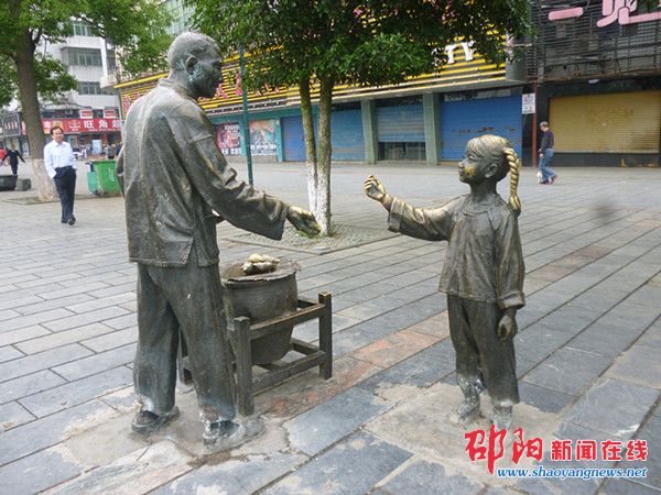 邵阳新闻在线讯(记者 谢婷婷)资江南路路边的铜像主要有三处,打糍粑、卖烤红薯、做猪血丸子,这些场景反映了古宝庆的人文风俗,引得行人驻足观看。然而‘卖烤红薯’的景观铜像遭遇损坏已久。原本位于小女孩旁边的小弟弟和小狗不翼而飞了。老爷爷旁边一大箩筐红薯也不见了踪影。火炉上的盖子有被撬过的痕迹,向上翻卷着。小女孩手中的钱币也被折断了一半。