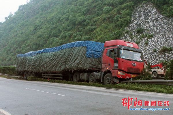 一名高速救援人员介绍了这三起交通事故的前后经过。15时15分许,细雨绵绵,路面有些湿滑。一辆河南籍大型货车,由西往东快速行驶到1268公里处(邵阳县岩口铺地段),这时,因为路面较滑,加之车速较快,车辆迅速冲出高速公路,右轮陷入高速公路外侧的沟渠中。幸运的是,货车向前方冲去时,被沟渠上的水泥盖板挡住,没有继续冲出高速公路。但是司机因为向前冲的巨大惯性,胸口被方向盘狠狠地顶住受伤。