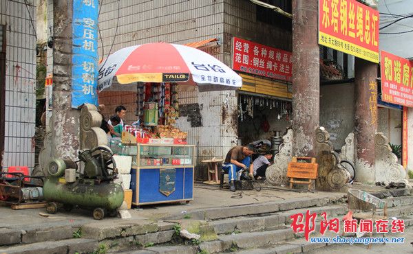 “邵阳市电动工具总汇”、“东塔钢丝绳总汇”、“和谐房产”,这些醒目的广告牌就张挂在东塔公园南门入口处的牌楼上,相比之下,本来就模糊不清“东塔公园”四个大字更显得黯淡无光。