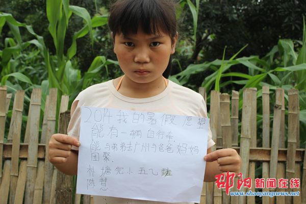 3、陈慧今年11岁,5年级学生,家住岩口镇朴塘村。父母在广州打工,她与弟弟跟随爷爷奶奶在家生活。陈慧懂事乖巧,能照顾年幼的弟弟,烧火做早饭,下午放羊。没有去过广州,最大的愿望就是能与弟弟一起去广州跟爸爸妈妈团聚;能有一辆自行车,带着弟弟出去玩。
