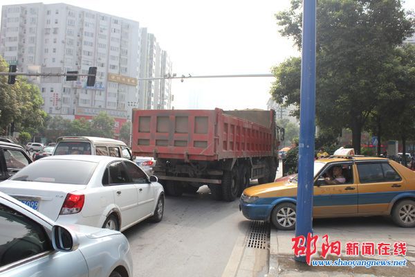 前面等待红灯的车辆占据右行车道,造成后面的车辆无法右转行驶,车子排成了一条长龙。
