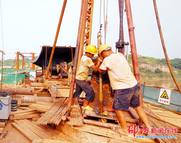 邵阳新闻在线讯(记者 杨敏华 实习生 孙娜 通讯员 杨松华)7月7日,施工人员冒着酷暑在桂花大桥工地上施工作业。该大桥东起大祥区城南街道桂花社区,西接北塔区茶元头乡刘黑村,全长539米、宽32米,设计双向6车道。该大桥去年8月开工以来,目前已完成连接东西两岸300多米的钢架桥和施工钢架平台,主桥桥墩已完成8个墩座。据介绍,施工方目前正在加紧推进主桥桥墩建设。