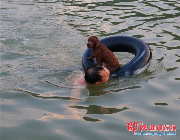 一只手托着救生圈里的孩子,另一只手向孩子示范游泳动作的基本要领,自己身后绑着一颗篮球来增加浮力,市民王先生在手把手地教孩子学游泳。在另一边,一位中年男子秉着“独乐乐不如众乐乐”的原则,让自家的宠物狗也坐上游泳圈,来了一场资江的“奇幻漂流”。