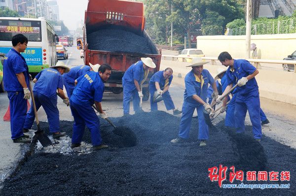邵阳新闻在线讯(记者 林森 宋三刚)将坑洼破损处的道路基层清理干净、用铲子均匀地铺上炙热的油砂,再用摊铺机碾压均匀平整……7月23日上午9时,在市区西湖桥头南侧,市政公司的工作人员正在进行桥面道路修复的扫尾工作。