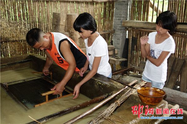 李志军正在指导刘雅瑜、刘雅珊姐妹俩学习抄纸。几乎每个月,都有学生来此手工纸坊体验古老工艺的魅力。