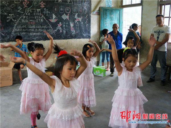 7岁的赵松祺领到新书包时,开心得像过年一样,朝志愿者鞠了一躬,大声地说了声“谢谢”。对这个一年只能和父母见一次面的小男孩来说,这份来自陌生的叔叔阿姨的关爱,也让他感受到了温暖和感动。面对志愿者们的问候与关心,这群淳朴的山里娃娃也用自己的行动表达心底的感谢。几个小女孩跟着音乐跳起了平日排练过的舞蹈《踏浪》,她们走心的表演也让志愿者们连连鼓掌。