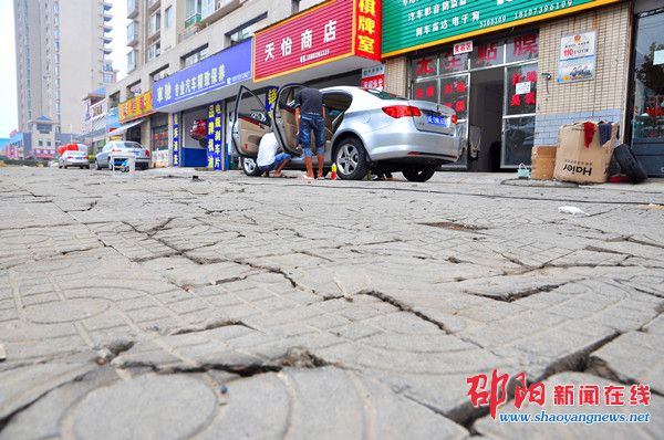 人行道板砖设计的承重原本就不足以抵挡车轮的重压,因而滚滚车轮成为人行道板砖的“头号杀手”。不光是西外街,在市区的双拥路、宝庆路等路段,只要车行聚集的地方,人行道板砖就难免遭殃。