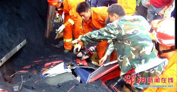经侦查,救援官兵发现,侧翻的大货车厢压在严重变形的驾驶室上,两名司乘人员卡在驾驶室内。由于驾驶室变形严重,两名司乘人员均为双腿被卡,其中一人头部外露,另一名被困人员则完全被驾驶室及泻下来的煤掩盖。情况万分危急,大队长贺颖立即下达救援命令。考虑到救援空间极其狭窄,且利用破拆工具施救有可能造成被卡人员的二次伤害。于是,救援人员利用液压扩张器、无齿链锯及液压钳对驾驶室进行破拆,清除被困人员身边的障碍物,并向市消防支队指挥中心请求特勤中队增援,同时联系隆回县人民医院的救护人员赶往现场。