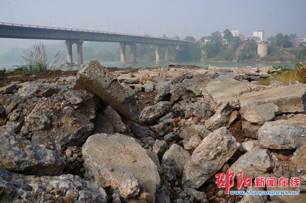 江堤上遗弃的大块水泥板全都是建筑垃圾。