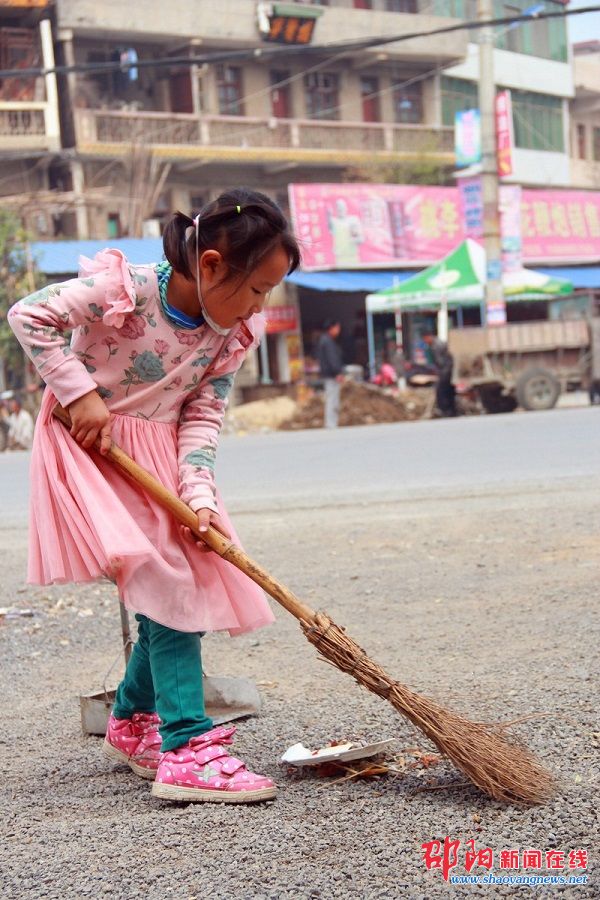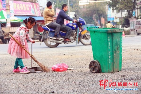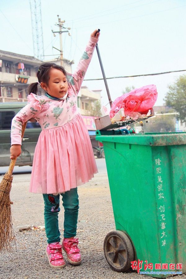 5岁的女童夏美玲双休日帮奶奶打扫社区卫生