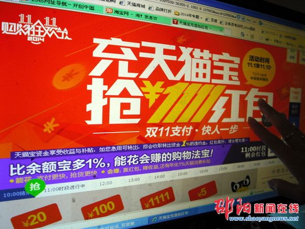 虽然跟“网购达人”相比,邵阳城区宝庆中路城南公园附近的小刘算不上疯狂网购族,但也隔三岔五在网上购物。最近,小刘连续收到关于“双十一”的邮件,打开淘宝、京东等购物网,“双十一”广告映入眼帘,一些预售商品已提前打响价格战。